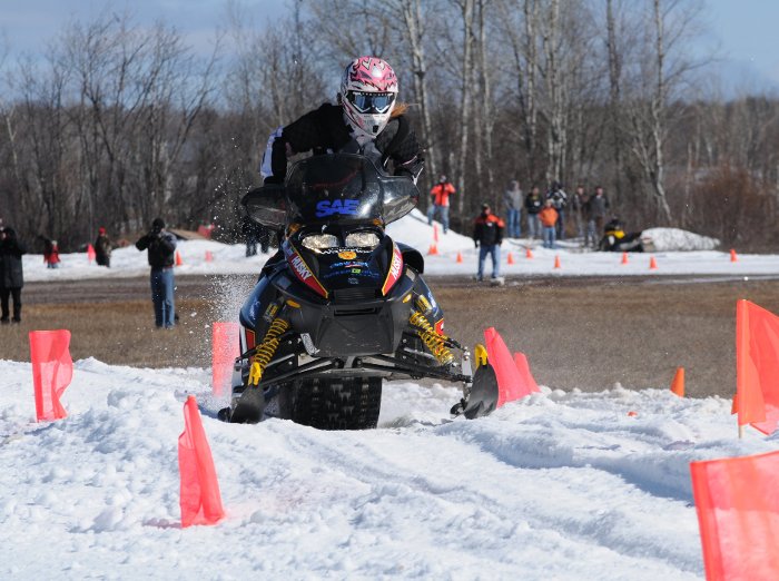 None of the Clean Snowmobile Challenge events had to be cancelled, despite an early spring thaw and temperatures that occasionally soared into the 60s. Saturday's handling and acceleration events were held on a raised track that was assembled for the occasion. "We had guys picking up snow with a front-end loader and literally making a snow road," said Jay Meldrum, co-director of the Challenge. "It's amazing what they were able to do."