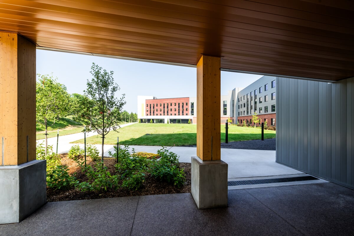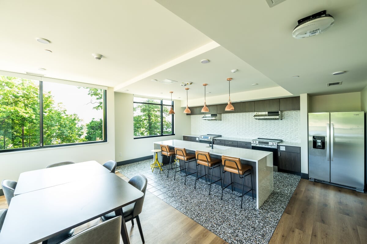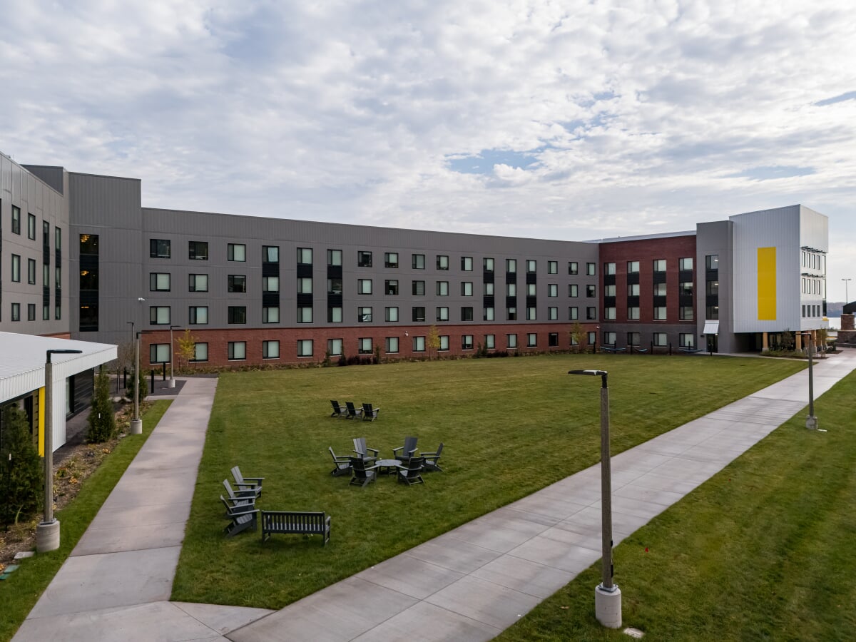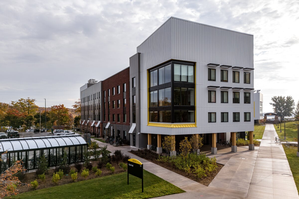 Located at the east entrance to campus, East Hall offers a modern, sustainable living experience. Its contemporary design combines vibrant, eco-friendly spaces with integrated technology for state-of-the-art comfort and convenience. The hall includes a variety of room types—four-person standard single and double suites with baths, private single rooms with baths, and ADA-accessible options including four-person, double, and single rooms with baths. East Hall accommodates more than 516 Huskies.