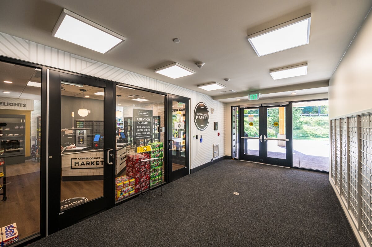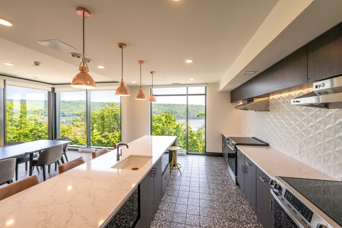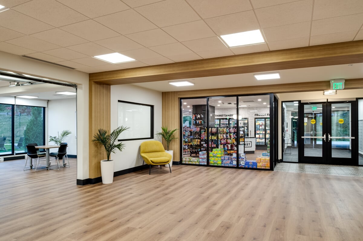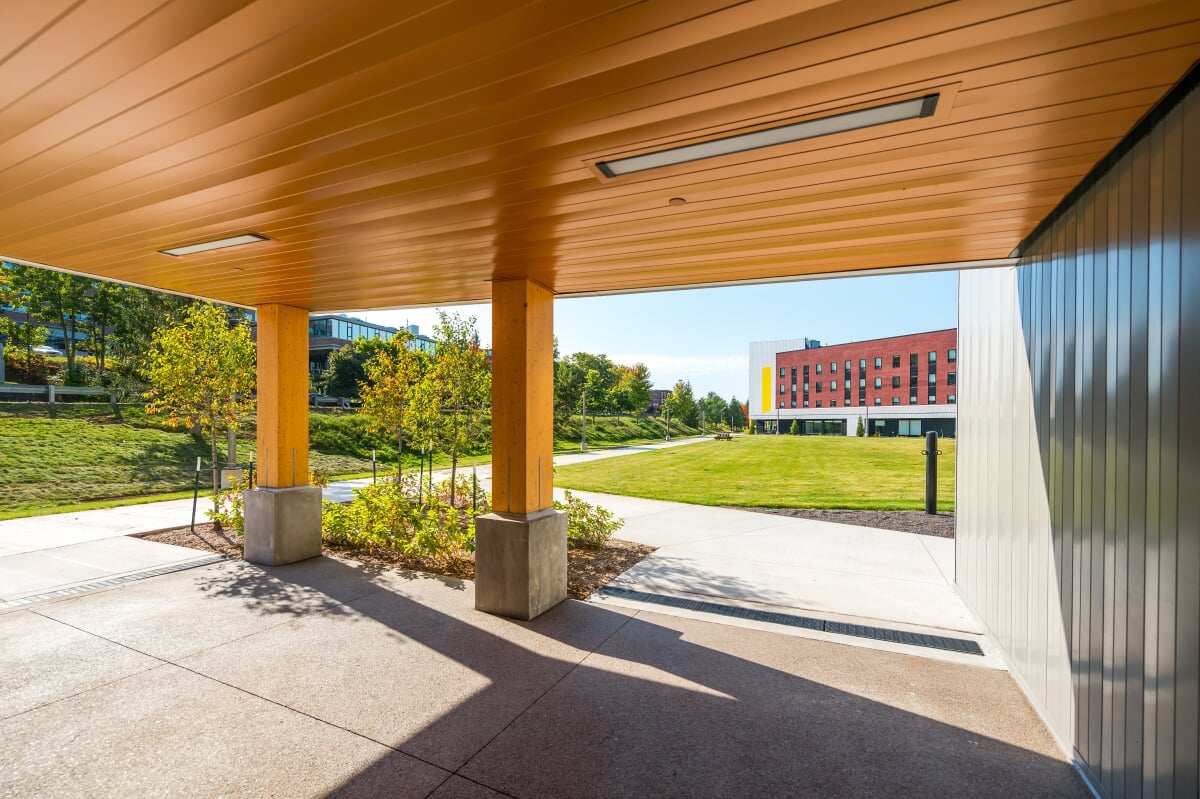 Located at the east entrance to campus, East Hall offers a modern, sustainable living experience. Its contemporary design combines vibrant, eco-friendly spaces with integrated technology for state-of-the-art comfort and convenience. The hall includes a variety of room types—four-person standard single and double suites with baths, private single rooms with baths, and ADA-accessible options including four-person, double, and single rooms with baths. East Hall accommodates more than 516 Huskies.