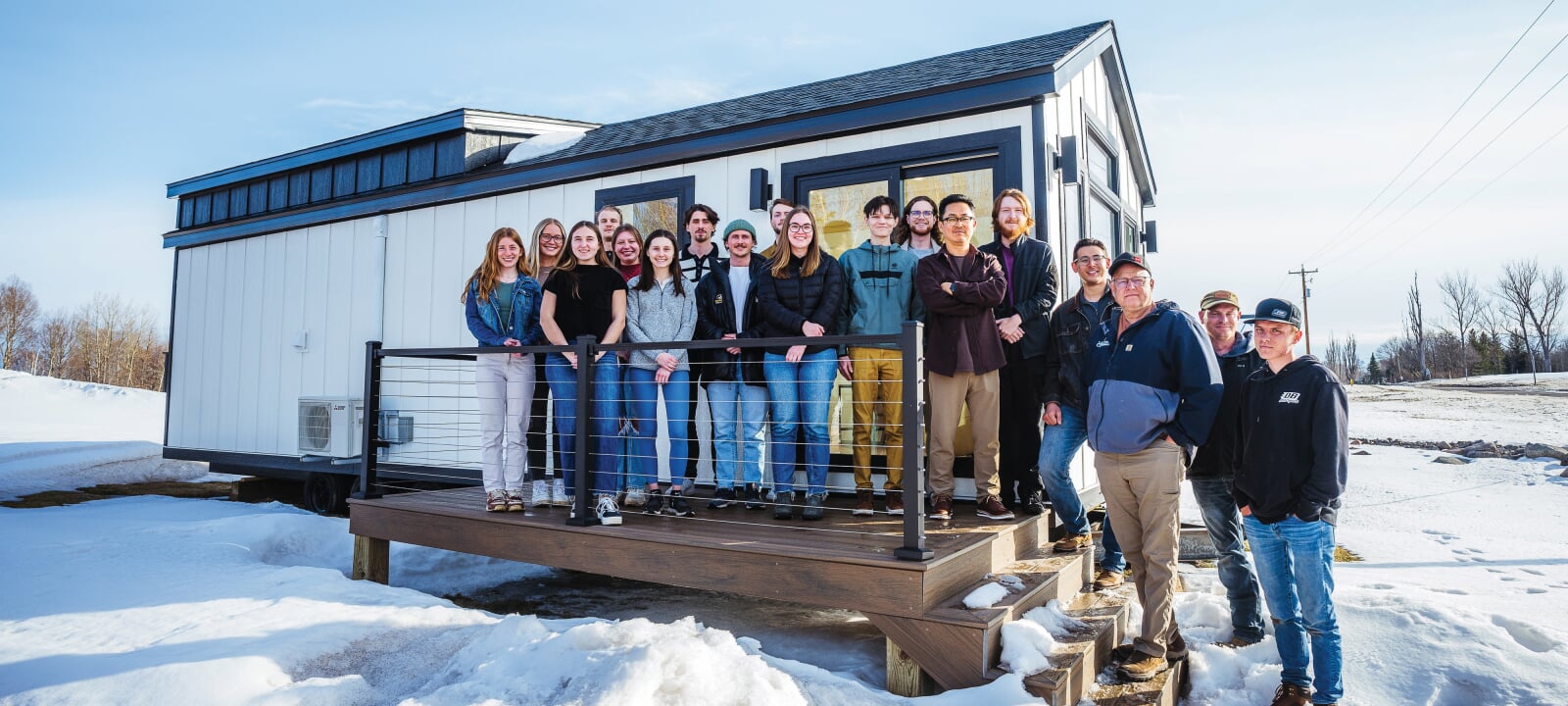 Michigan Tech students from Associate Professor Soonkwan Hong’s Marketing Strategy capstone course stand with the Brockway Mini Homes team on the porch of the company’s first small home model. Huskies are known for working with real clients to develop their professional skills, and Hong’s students helped develop Brockway’s marketing plan, offering fresh perspectives as the company branched out into the small homes market. Learn more about the project (including client feedback) and how Huskies provide marketing solutions close to home.