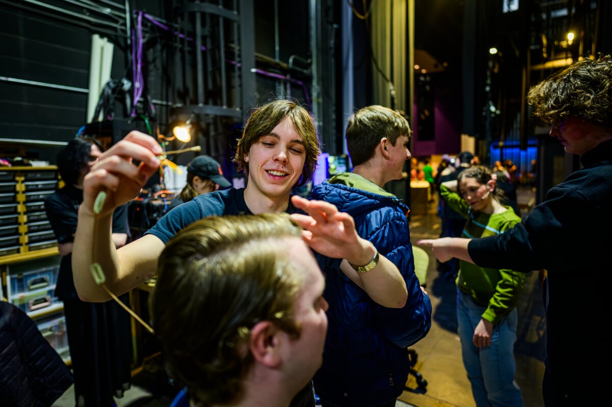 What do theatre techs do behind the curtains? At Michigan Tech, the answer is "a little bit of everything." Behind the scenes, Huskies design and run lighting and sound cues, build sets, paint scenery, manage props, sew costumes, apply makeup, solve last-minute problems, help keep actors on cue—and more.