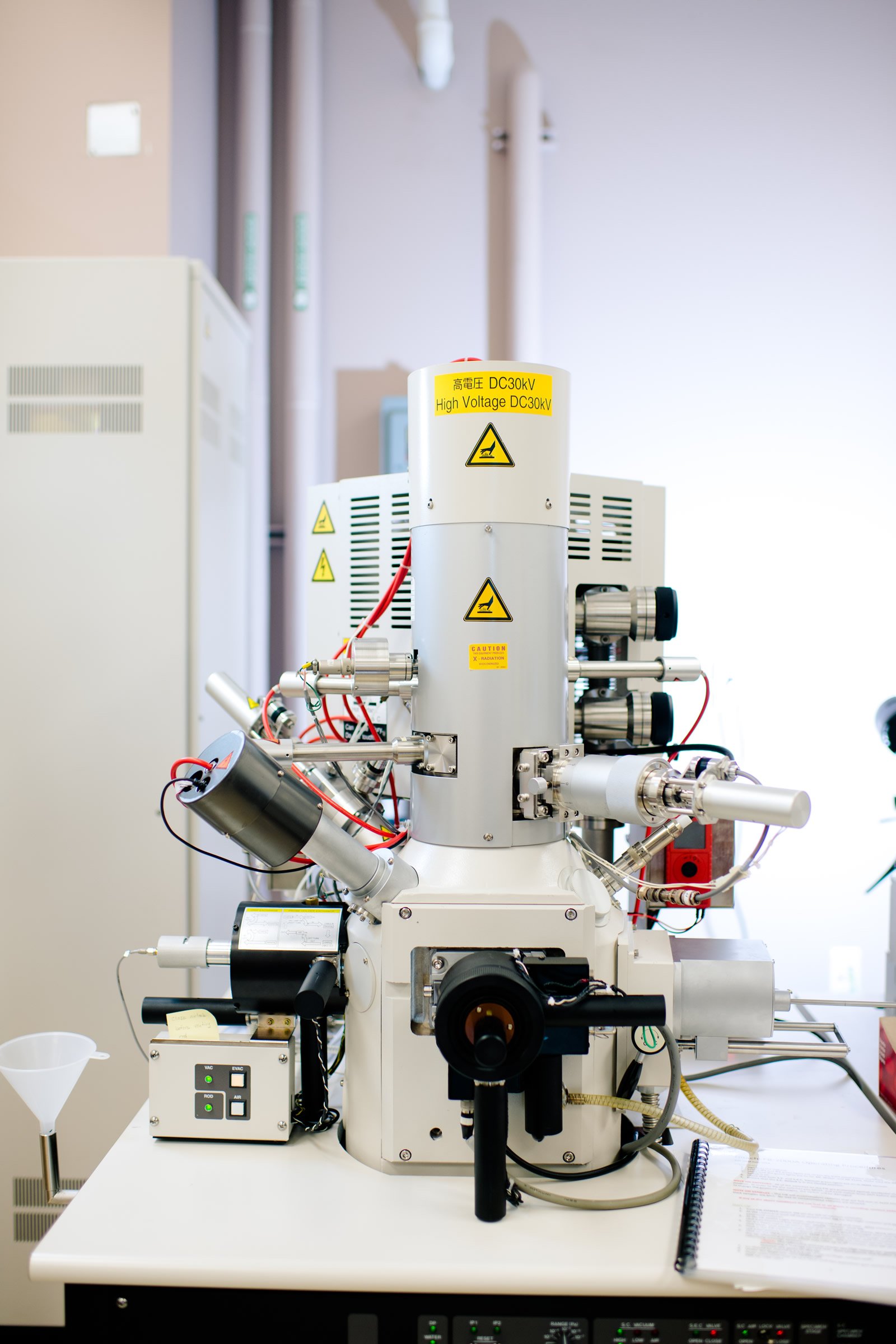 The Hitachi FB-2000A FIB uses a beam of focused high-energy (30 kV) gallium ions to remove material in a very controlled manner from inorganic specimens. The FB-2000A is a single beam system; that is, users image the specimen with the same beam used for milling. The column resembles that of an electron microscope and functions very much the same. Control of the ion beam is gained through the Unix workstation and fabrication software system that is designed to support both TEM sample preparation and pattern milling.