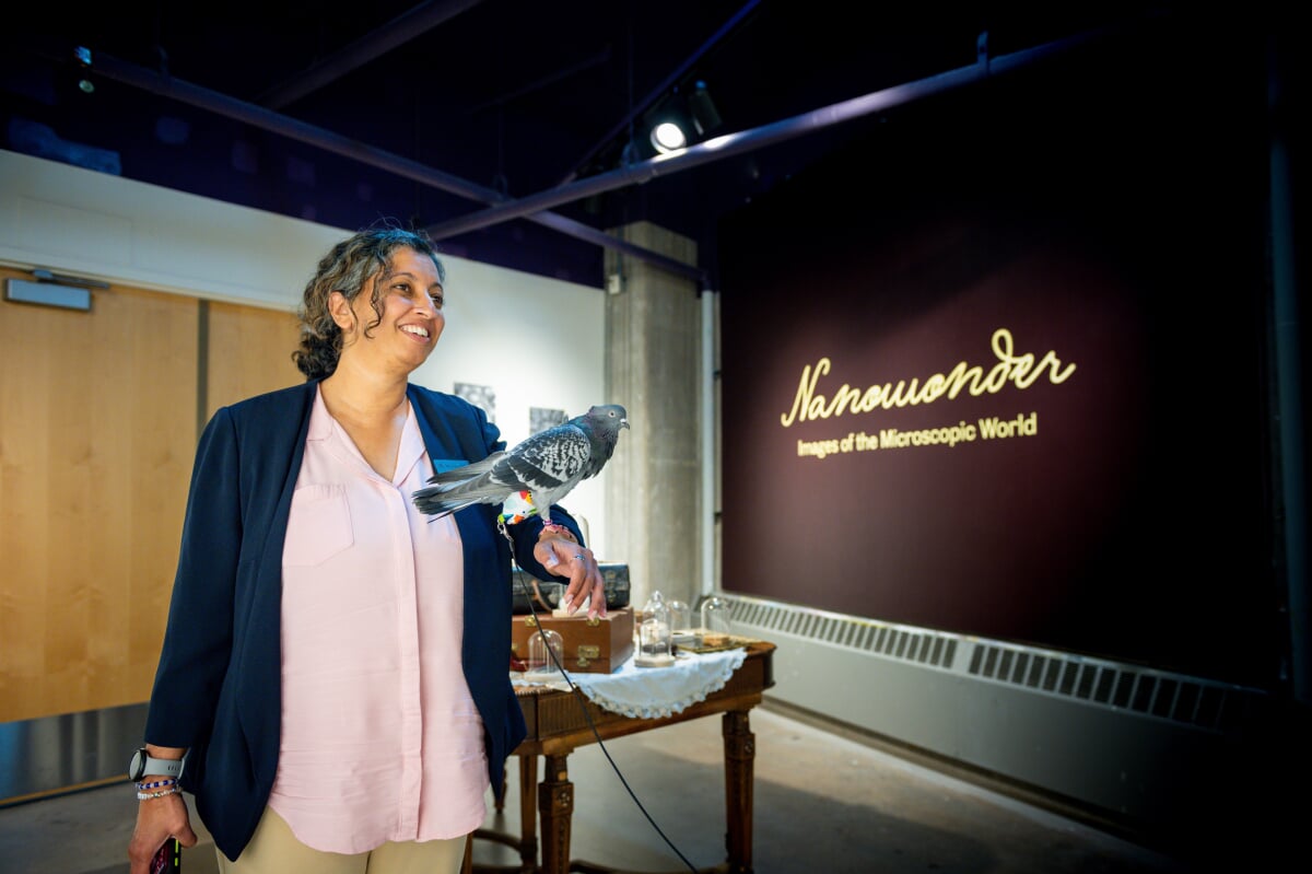 The capabilities of the Hitachi SEM were on full display Sept. 27 as a lively crowd of campus and community members of all ages gathered for the exhibit's opening reception. Many accepted the Rozsa's invitation to bring their own samples for magnification, and were dazzled as researchers operating the high-powered microscope projected magnified images on a large screen for all to see. Among the special guests was Sonnet the Pigeon, whose feather image was on display in the exhibition.